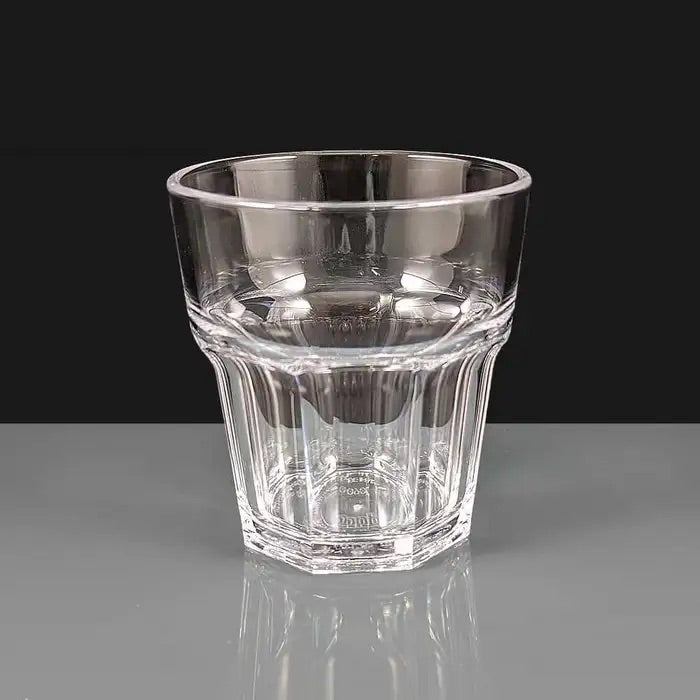Shatterproof reusable glass, made from food grade plastic. Tested over 1000 dishwasher cycles with no visual detraction.