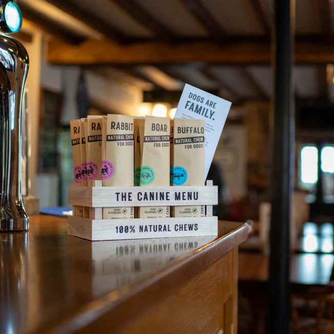 Set up your dog menu from scratch with our mixed box containing Rabbit, Boar and Buffalo dog chews plus ten printed dog menus, a branded wooden crate and a dog friendly window sticker. Naturally air-dried using no additives or preservatives, you can be confident that these 100% natural dog chews will go down a treat with your canine customers.